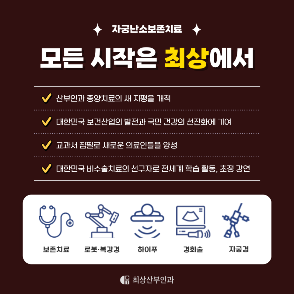 저희 최상산부인과에서는 종양의 크기, 위치, 환자의 연령, 증상의 정도 등을 고려해 적절한 방법으로 난소기형종 치료를 진행하고 있습니다. 난소기형종이라고 해도 작은 크기이고 통증이나 불편함이 없는 경우라면 일정 기간 동안 크기를 체크하면서 변화를 지켜보는 추적관찰을 시행하거나 호르몬 치료나 약물 치료를 통해 더이상 악화되지 않도록 하는 방법을 고려해볼 수 있습니다.