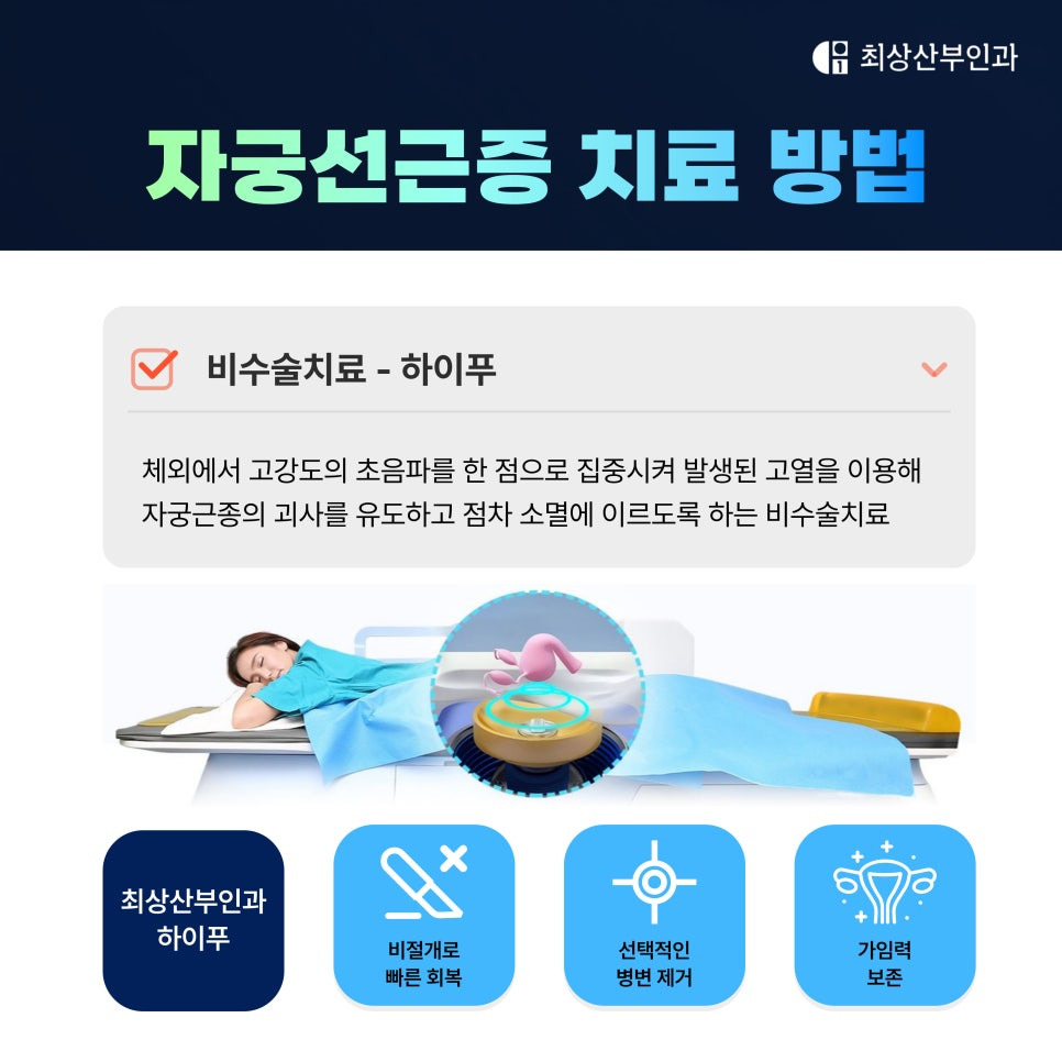 하이푸는 고강도 초음파를 이용해 병변을 선택적으로 제거하는 방법인데, 절개가 필요 없고 회복이 빠른 것이 장점이에요.