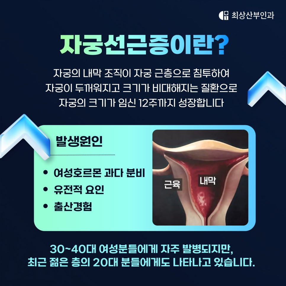 자궁선근증은 자궁 내막 조직이 자궁 근육층으로 침투하면서 염증과 부종을 유발하는 질환이에요.
