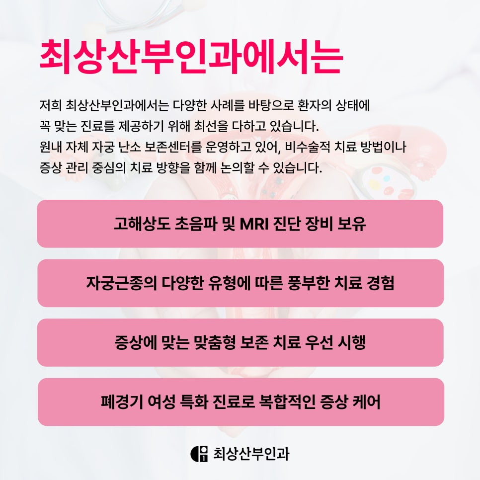 저희 최상산부인과에서는 다양한 사례를 바탕으로 환자의 상태에 꼭 맞는 진료를 제공하는 데 집중하고 있는데요, 정밀 초음파와 MRI, 그리고 다양한 치료 경험을 바탕으로 단순한 증상 분석이 아닌, 근본적인 원인 파악에 중점을 두고 있어요.