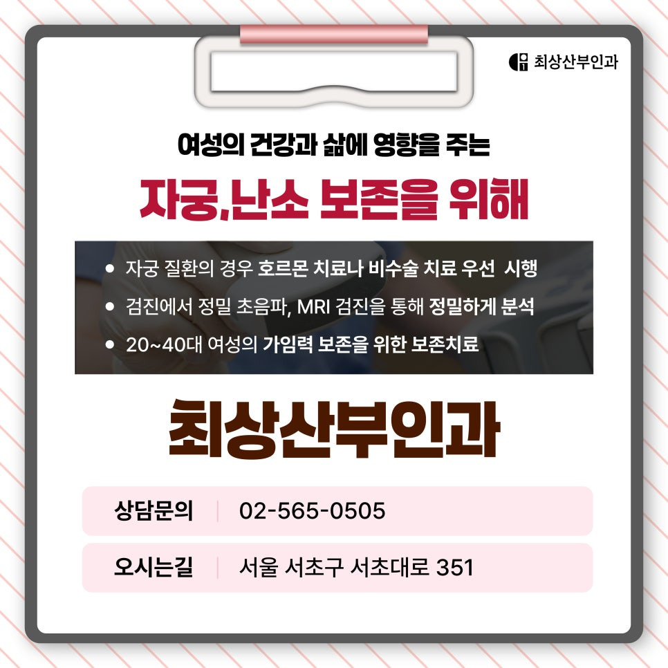 최상산부인과는 이 부분의 중요성을 누구보다 잘 알기에, ‘자궁·난소 보존센터’를 따로 운영하면서 수술이나 치료가 필요한 상황에서도 무조건 절제보다는 ‘보존’을 우선하는 방향으로 접근하고 있습니다.