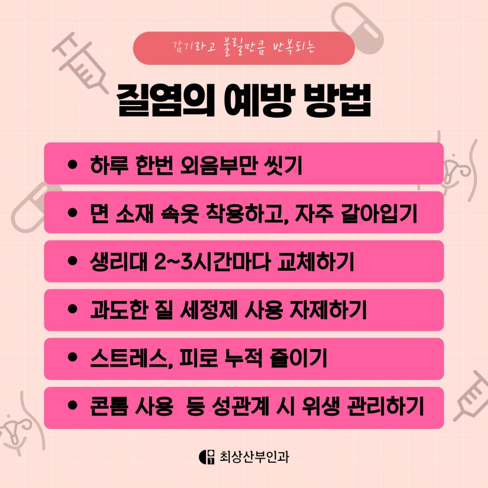 또한, 통풍이 잘 되는 면 소재 속옷을 착용하고, 땀이 많거나 생리 중일 땐 하루에 속옷을 2~3번 갈아입는 것이 좋습니다. 생리대도 2~3시간 간격으로 교체해 주셔야 하죠. 스트레스를 줄이고 면역력을 높이는 것도 중요한 포인트입니다.