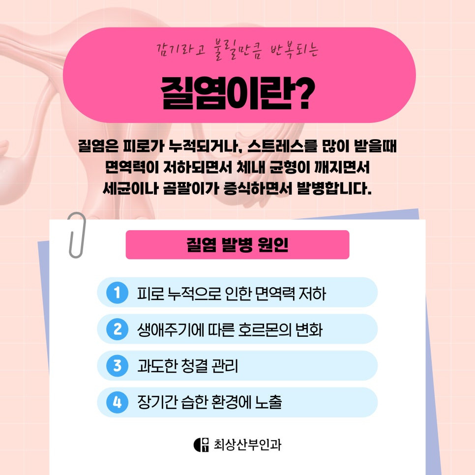 말 그대로 질 안의 점막이나 주변 조직에 염증이 생긴 상태를 말해요. 보통 한 가지 원인보다는 면역력 저하, 세균 감염, 호르몬 변화, 잘못된 위생 습관 등 복합적인 요인으로 발생하게 됩니다.