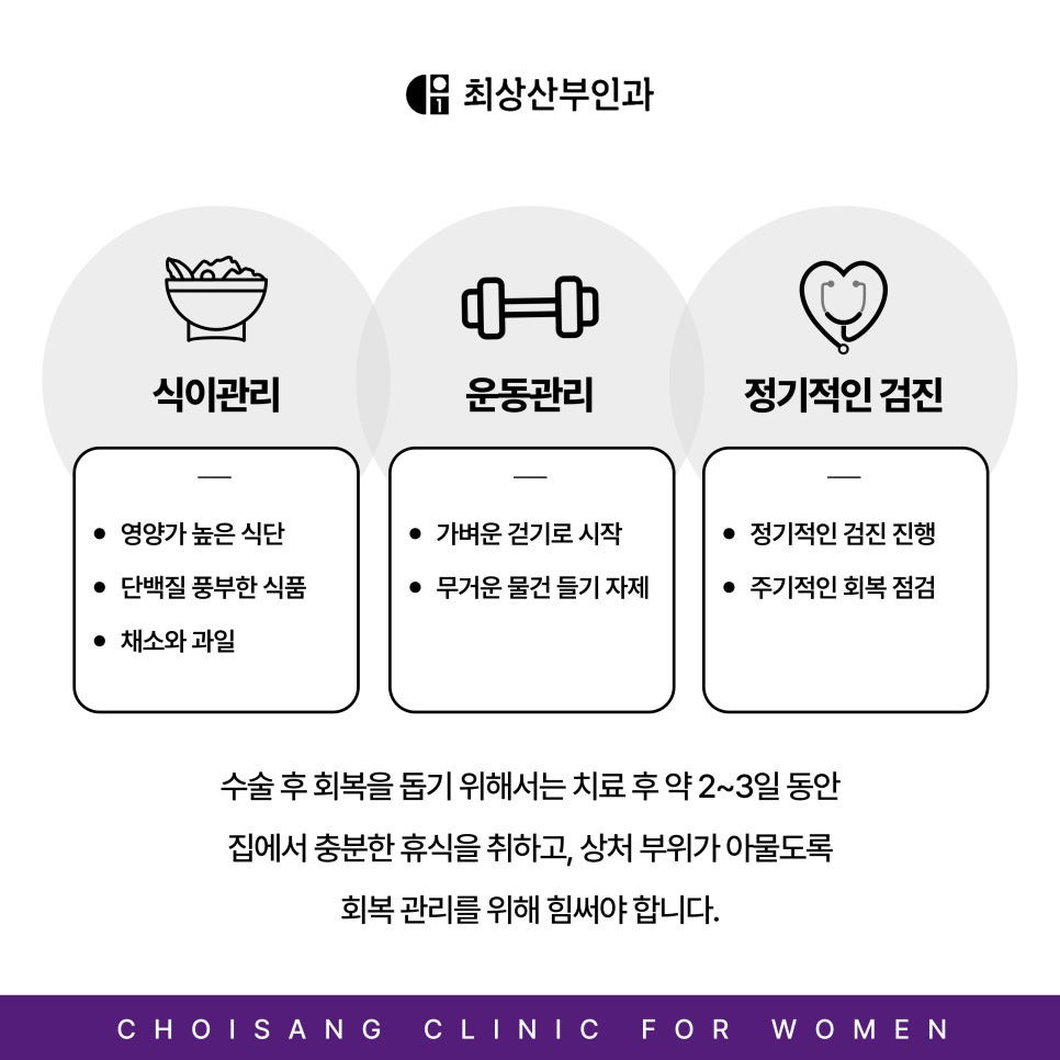 혹시 수술 후 관리에 대해 궁금하신 게 있다면, 주저하지 말고 저희 최상산부인과를 내원하여 상담받아보시기 바랍니다.