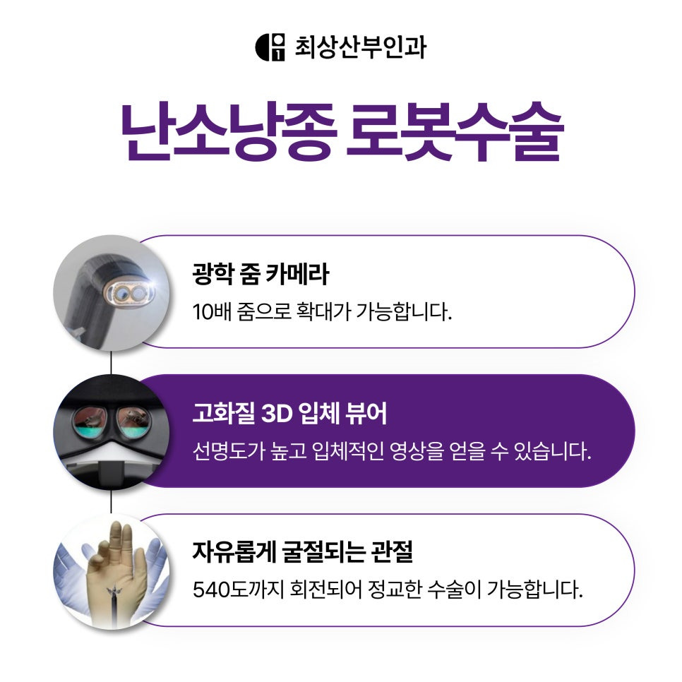강남에 위치한 저희 최상산부인과에서 시행하는 로봇수술은 기존의 복강경 수술에 비해 보다 정밀하고, 작은 절개를 통해 진행될 수 있어요. 이 덕분에 수술 후 회복이 빠르고, 통증이 적어 일상생활로의 복귀가 비교적 빠른 편이죠.