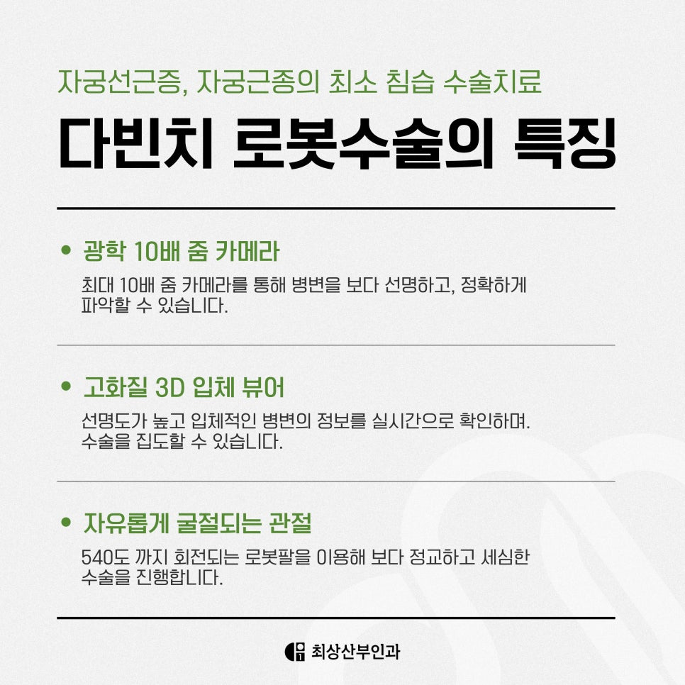 최상산부인과는 여성 질환 중에서도 자궁 보존을 고려한 고난이도 수술을 다수 시행한 병원으로, 다빈치 로봇수술 시스템을 갖춘 특화 진료를 운영하고 있습니다.