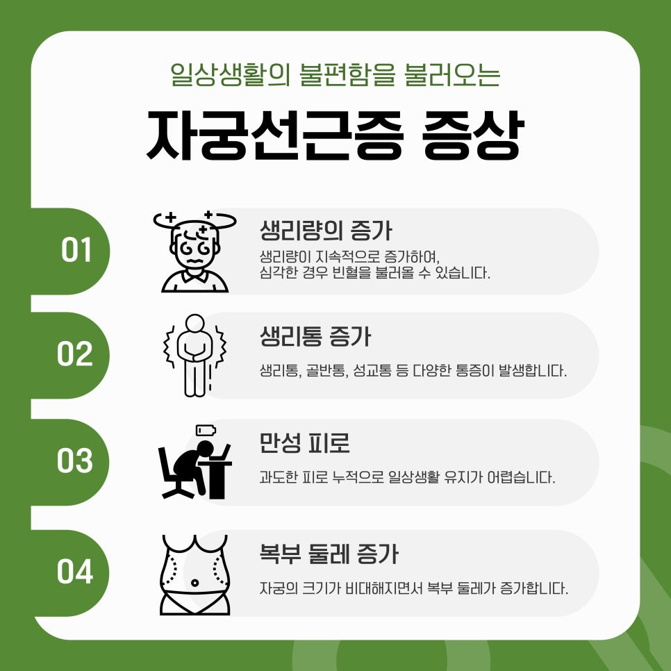 자궁선근증은 단순한 생리통이 아니라, 시간이 지나면서 자궁 기능과 삶의 질에 큰 영향을 줄 수 있는 질환입니다.