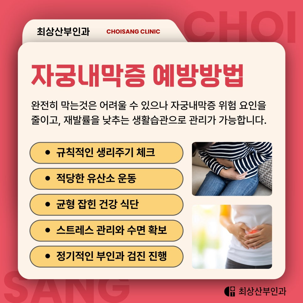 완전히 막는 것은 어려울 수 있지만, 자궁내막증은 위험 요인을 줄이고 재발률을 낮출 수 있는 생활습관 관리가 가능합니다.