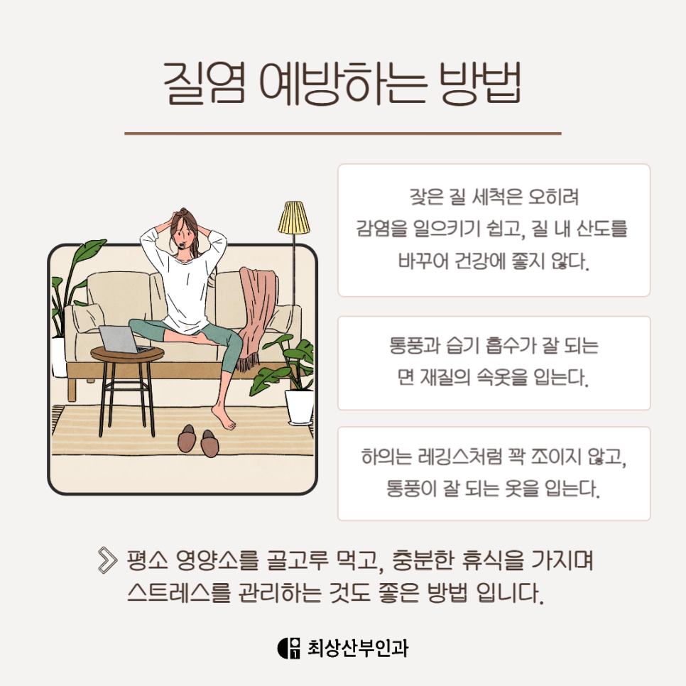 해당 질환은 재발이 잦은 만큼 치료만큼이나 예방과 관리가 핵심입니다. 여러 번 같은 증상으로 고생하고 있다면, 저희 최상산부인과를 내원하여 상담받아보시기 바랍니다.