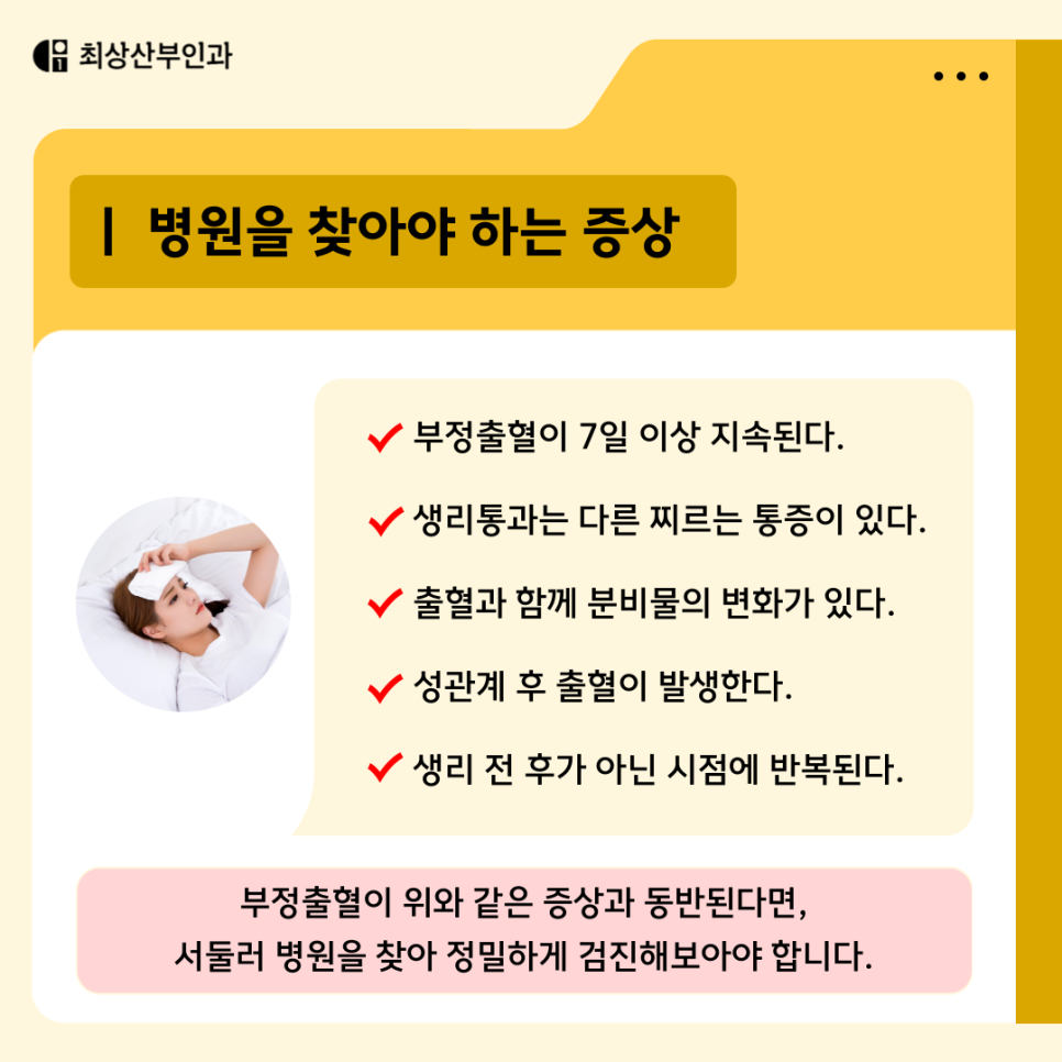 부정출혈과 함께 다른 증상이 동반된다면 일시적인 증상이 아닐 가능성이 높아집니다. 대표적으로 하복부 복통, 허리통증, 골반의 묵직함이 동반된다면 자궁 주변 조직에 염증이나 병변이 생긴 상황일 수 있죠. 특히 다음과 같은 경우에는 반드시 산부인과 진료가 필요해요.