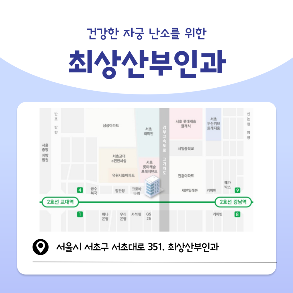 다낭성난소증후군은 평생 함께 가야 하는 질환이 아닙니다. 초기에 적절한 진단과 치료가 이루어진다면, 충분히 난소를 보존하면서도 증상 개선과 임신 가능성까지 높일 수 있죠. 다양한 자궁, 난소 질환으로 인해 반포산부인과를 찾고 계시다면, 저희 최상산부인과를 내원하여 상담받아보시기 바랍니다.