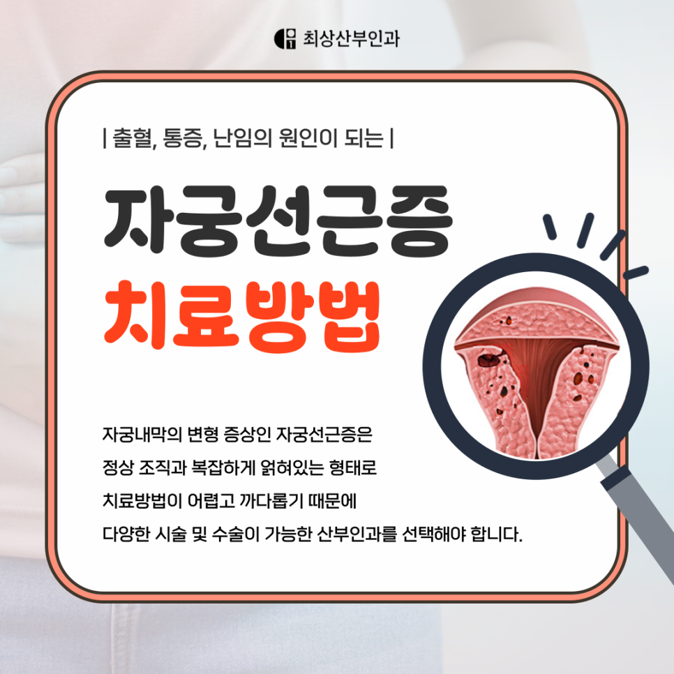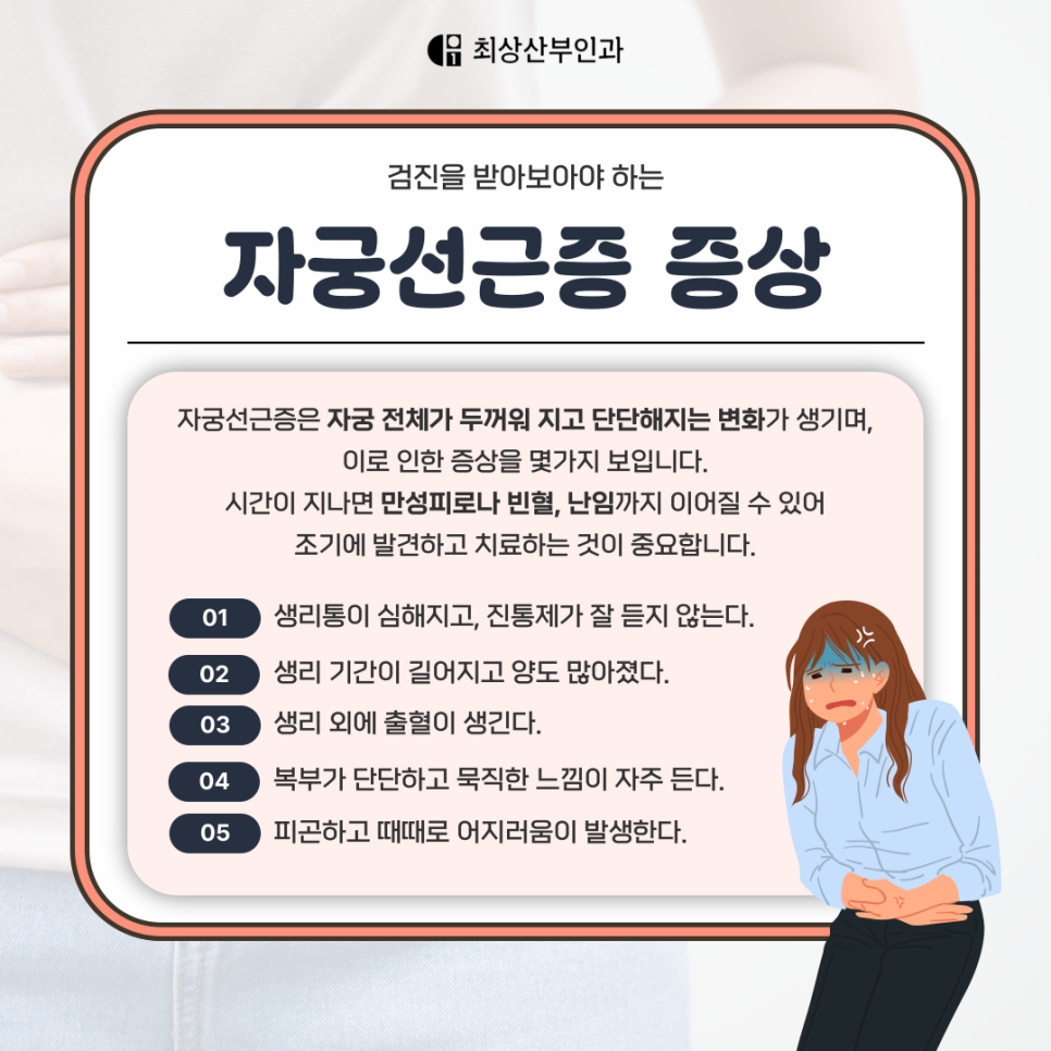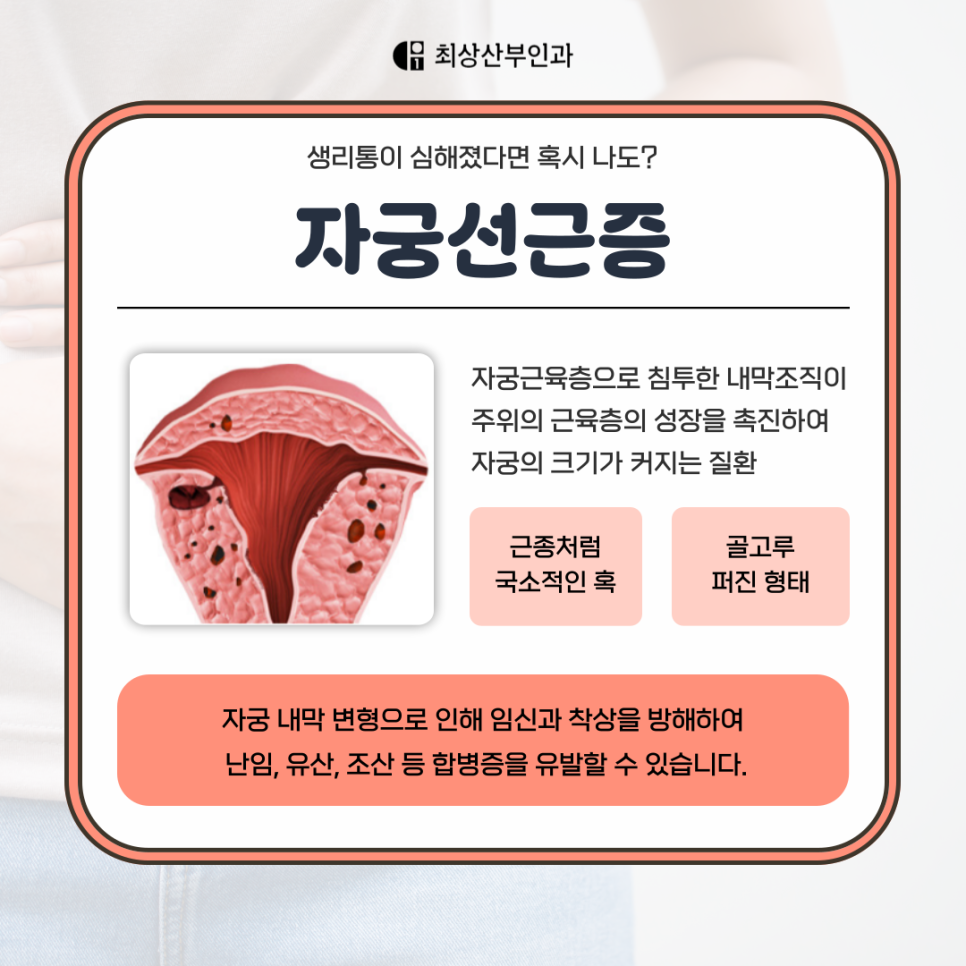 초기에는 증상이 미미할 수 있지만, 점점 자궁이 커지고 염증 반응이 반복되며 자궁 전체에 통증과 불편감이 퍼지게 되는 진행성 질환이죠.