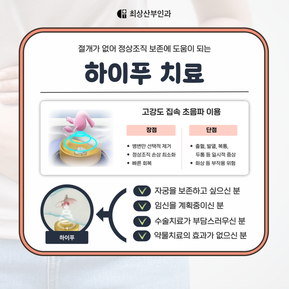 많은 분들이 자궁 질환이라고 하면 자궁을 제거해야 한다고 오해하시는데요, 자궁선근증은 자궁을 제거하지 않고도 증상 개선이 가능한 치료법이 있습니다. 바로 하이푸 (HIFU, 고강도집속초음파치료술) 이죠.