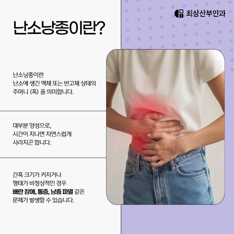 난소낭종은 말 그대로 난소에 생긴 액체 또는 반고체 상태의 주머니(혹)를 말해요. 크기나 내용물, 성격에 따라 여러 종류로 나눌 수 있으며, 대부분은 양성(비암성)으로 시간이 지나면 자연스럽게 사라지기도 한답니다. 그렇지만 간혹 크기가 커지거나, 형태가 비정상적인 경우 배란 장애, 통증, 낭종 파열 같은 문제가 생길 수 있죠.
