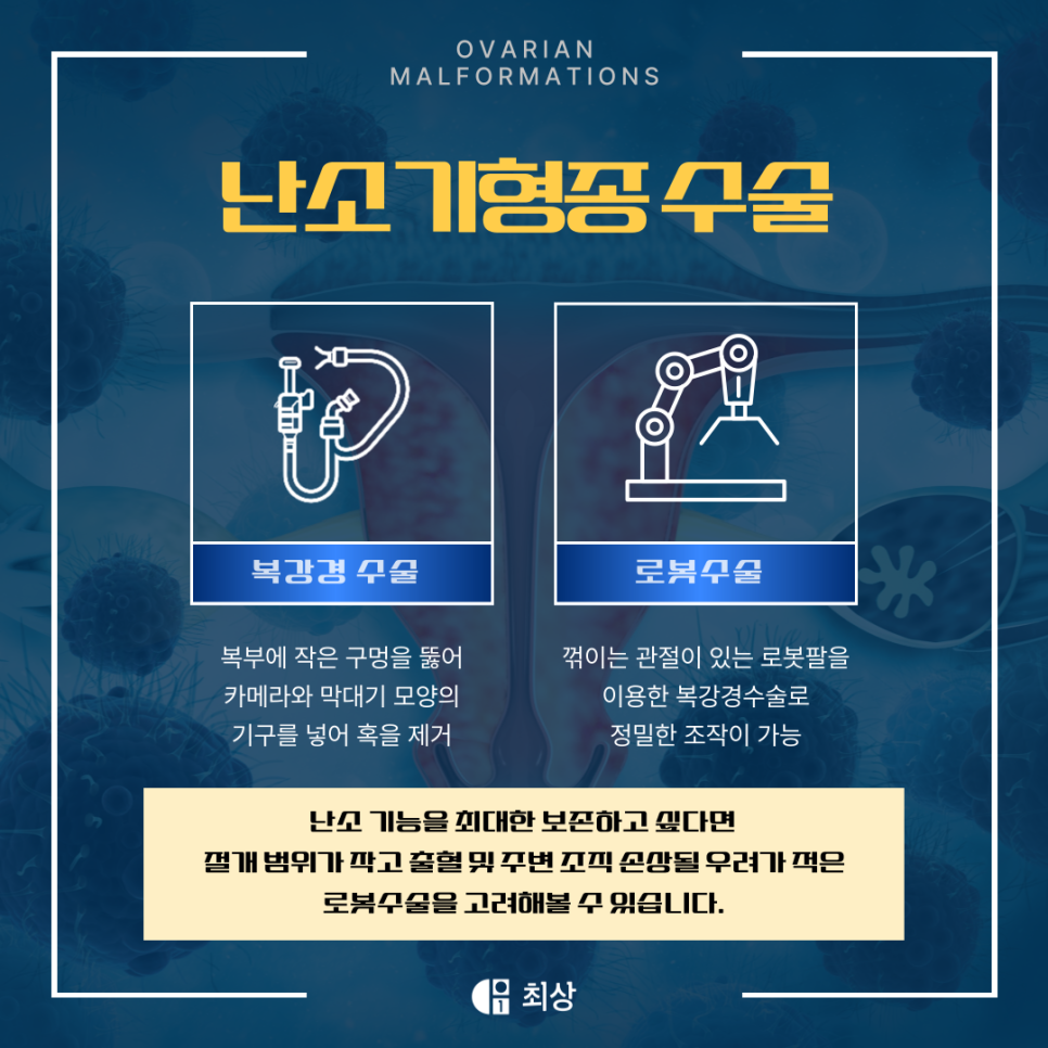 이때 많은 분들이 “수술을 하면 난소 기능이 떨어지지 않을까?” 하는 걱정을 하시곤 합니다. 이에 최상산부인과에서는 난소 정상 조직을 최대한 보존하기 위한 최첨단 수술 방법인 로봇수술을 진행하고 있는데요.