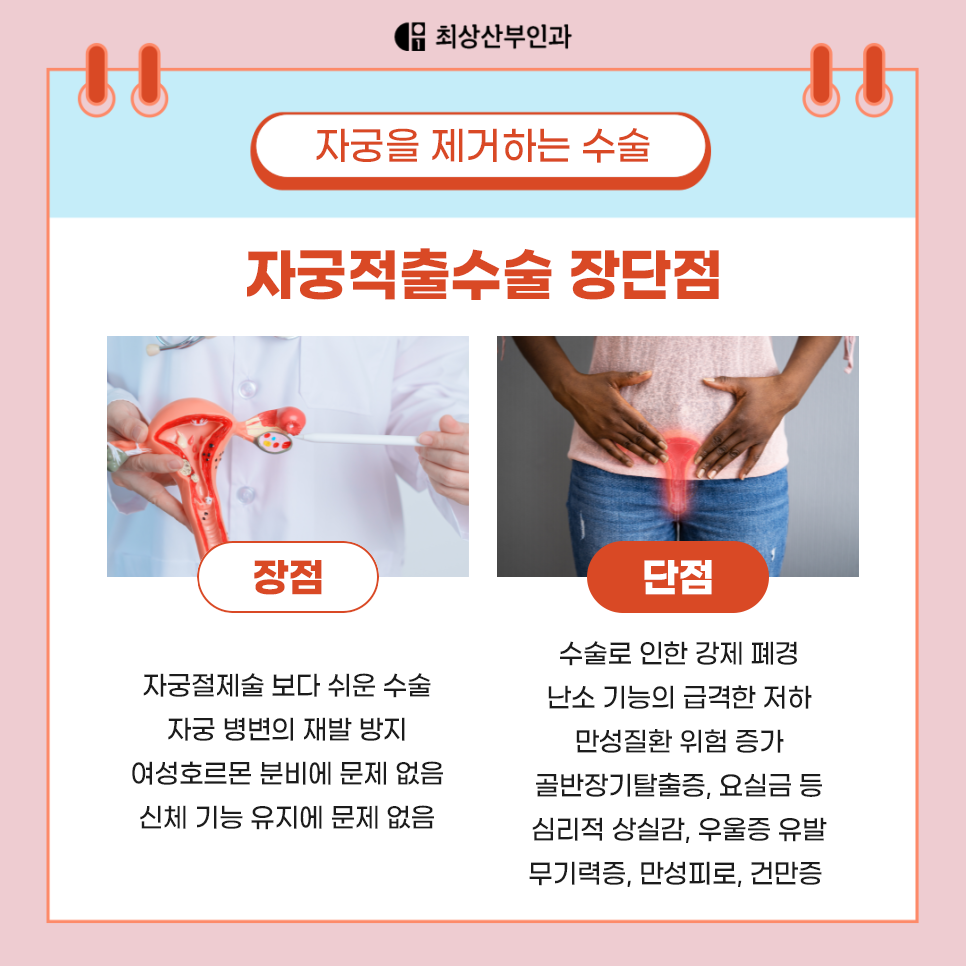 오늘은 신사역산부인과로 찾아주시는 저희 최상산부인과와 함께 자궁적출 후유증에 대해 알아보았는데요, 자궁적출술은 분명 신중한 결정이 필요하지만, 모든 자궁 질환이 곧바로 적출로 이어지는 것은 아니에요 증상과 상태에 따라 자궁을 보존하면서 치료할 수 있는 방법도 다양해졌죠.