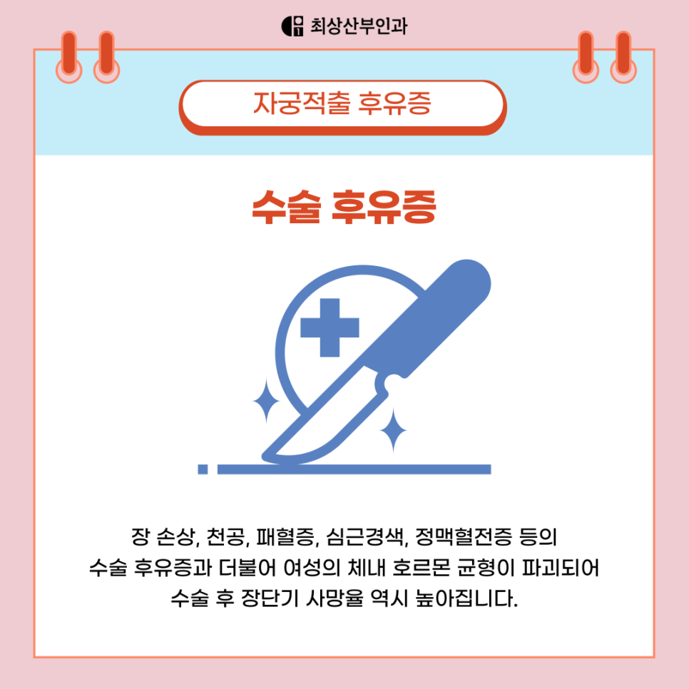 더불어 수술 과정에서 자궁을 지탱하던 인대와 골반저 근육이 약해지거나 손상될 수 있어, 그 결과 요실금 증상이 나타나기도 한답니다.