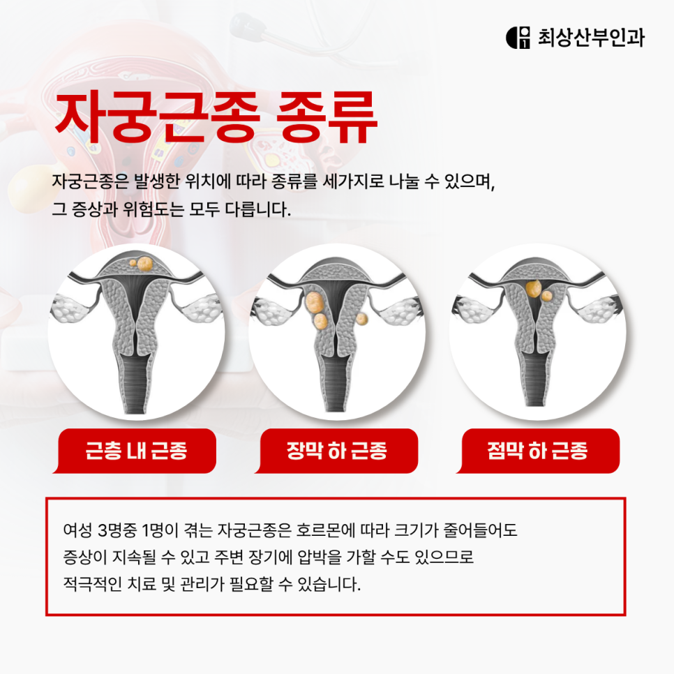 일반적으로는 무증상인 경우도 있지만, 하복부 통증, 생리 과다, 골반 압박감, 소변이 잦거나 변비와 같은 증상이 나타나기도 한답니다. 심한 경우엔 출혈이 심각해져 빈혈이 생기기도 하고, 임신에 영향을 미치기 때문에 난임을 유발하기도 해요.