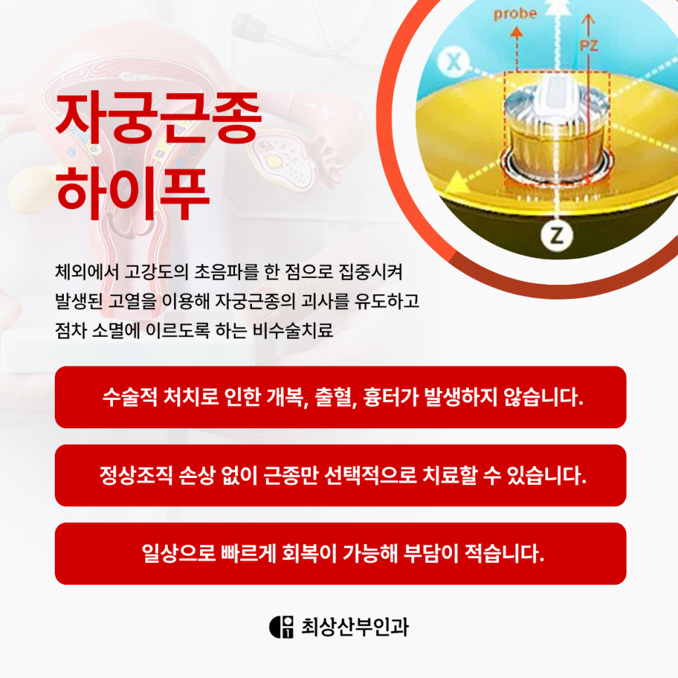 최근에는 수술적 제거보다 비수술적 방식인 하이푸(HIFU, 고강도 집속초음파) 치료가 각광받고 있습니다.