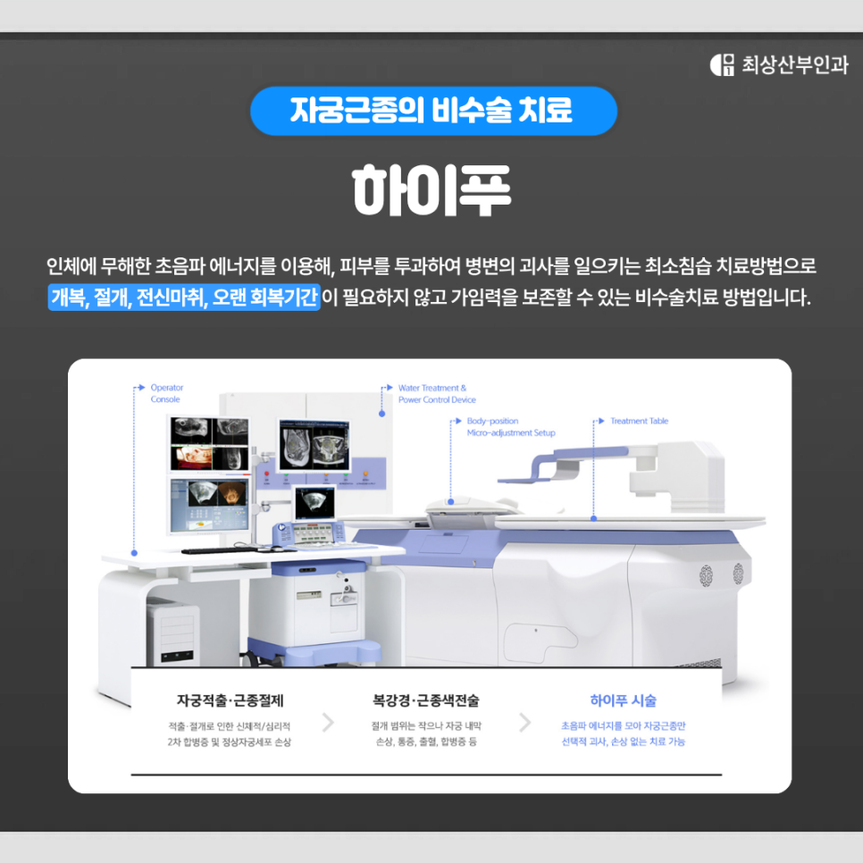 자궁근종 치료에 있어서는 하이푸(고강도집속초음파) 치료 시스템을 도입하여, 절개하지 않고 근종 크기를 줄이는 치료를 실천하고 있으며. 통증·출혈 감소 및 일상 복귀가 빠른 치료 제공을 목표하고 있답니다.