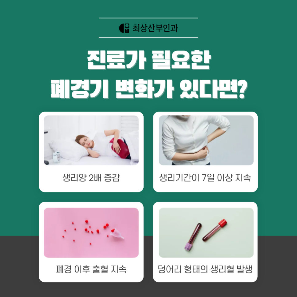 즉, 이런 변화는 대부분 자연스러운 폐경 전 단계(전폐경기)에서 나타날 수 있습니다. 하지만 지속적이거나 과도한 출혈, 하복부 통증, 피로감이나 어지럼증이 동반된다면 단순한 폐경 증상이 아닌 자궁근종, 자궁내막증, 자궁내막용종 등 질환의 신호일 가능성도 고려해 보아야 해요.
