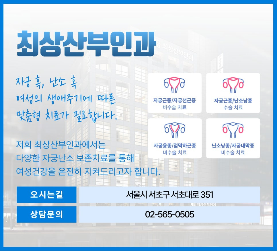 오늘은 작은 크기로도 방심할 수 있는 점막하근종에 대해 알아보았는데요, 추가적인 문의가 있다면 서초산부인과를 대표하는 저희 최상산부인과를 내원하여 편안한 마음으로 상담받아보시길 바랍니다.