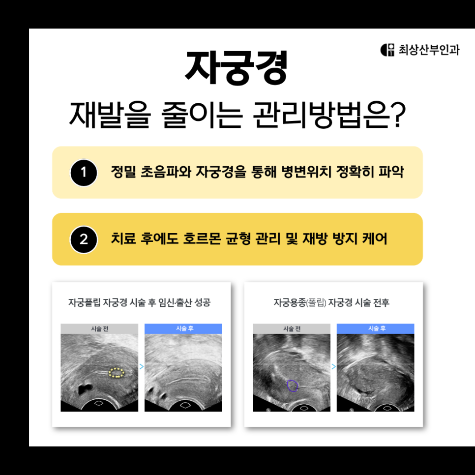 자궁내막용종 제거 후에도 호르몬 불균형이나 내막 재생 이상이 남아있다면 재발 가능성이 존재합니다. 따라서 최상산부인과에서는 치료 후에도 호르몬 조절요법, 영양 및 체중 관리, 주기적 초음파 추적검사 등을 통해 자궁 상태를 지속적으로 모니터링하고 있어요.