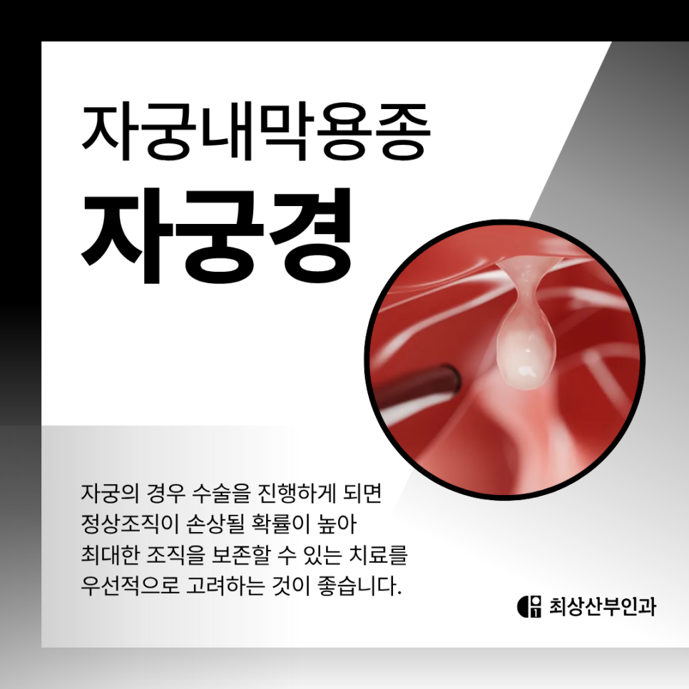 특히 최상산부인과에서는 고해상도 자궁경 장비와 풍부한 경험의 의료진의 노하우를 바탕으로, 자궁내막용종뿐 아니라 자궁근종, 자궁선근증, 내막유착 등 다양한 병변의 정밀 진단이 가능해 흔히 사용되고 있는 치료방법이랍니다.
