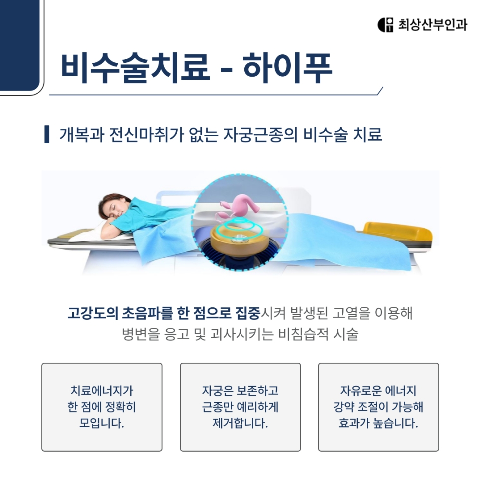 최상산부인과에서는 산부인과 경험이 풍부한 전문의가 상주하며 직접 검사 결과를 토대로 가능성을 평가하고, 하이푸가 적합하지 않은 경우에는 약물치료나 수술적 치료까지 포함해 환자 상태에 맞는 방향을 설명해 드리고 있어요.