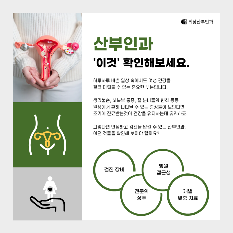 가장 먼저 확인해야 할 것은 해당 병원이 산부인과 전문의가 직접 진료하는지입니다. 최근에는 미용·건강 클리닉과 산부인과가 함께 운영되는 경우가 많지만, 산부인과 질환은 반드시 경험이 풍부하면서도 전문의의 노하우와 판단이 필요하다고 말씀드릴 수 있는데요,