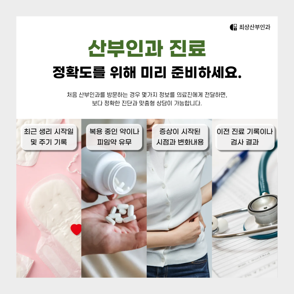 처음 산부인과를 방문하는 경우라면 위와 같은 몇 가지 사항을 알아두면 좋습니다. 이러한 정보를 의료진에게 전달하면 보다 정확한 진단과 맞춤형 상담이 가능하기 때문이죠.