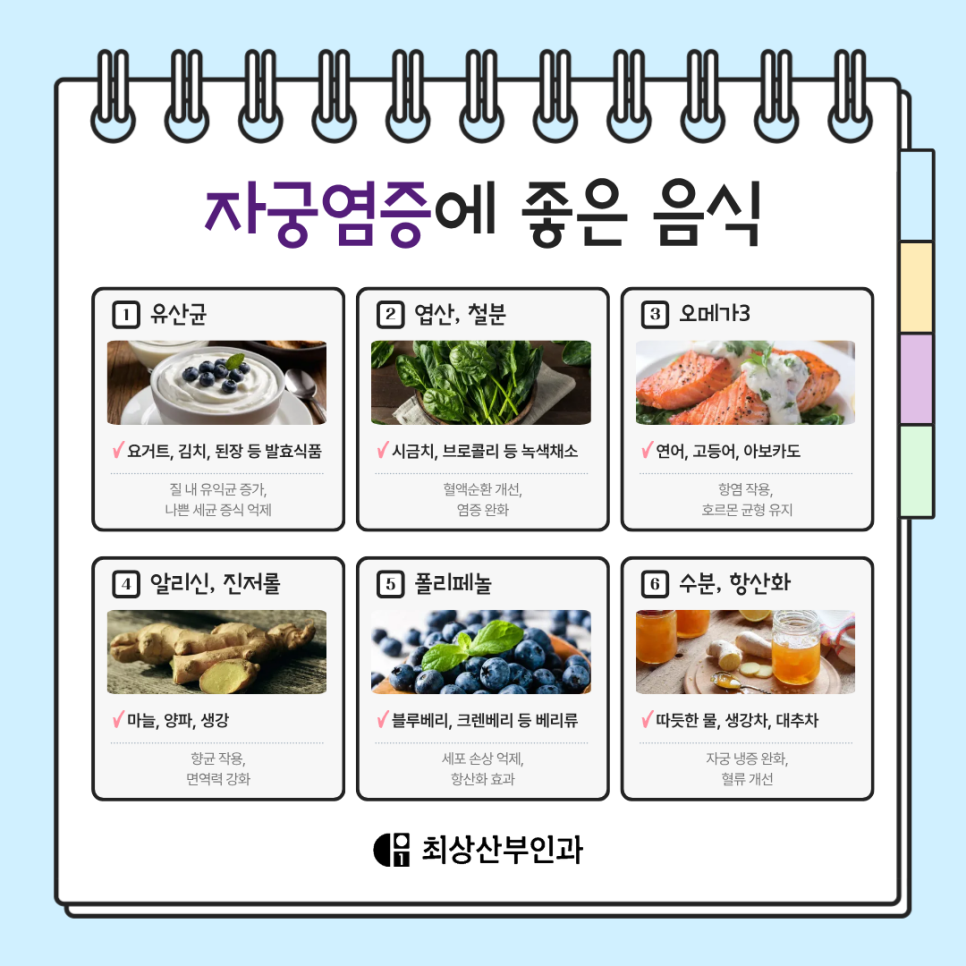 특히 유산균이 풍부한 식품은 질 내 유익균 비율을 높여 감염 재발을 줄이고, 따뜻한 음식은 혈류를 개선해 자궁의 면역력을 높여줄 수 있어 바쁘시더라도 정량을 섭취해 주시는 것이 좋아요.