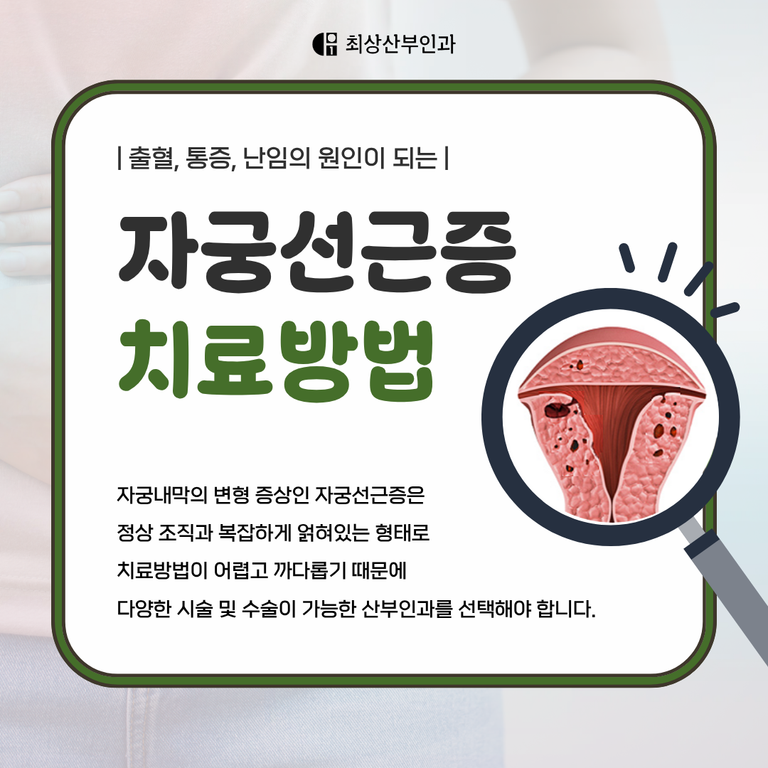 자궁선근증은 자궁근육층 안쪽으로 자궁내막조직이 침투해 두꺼워지는 질환으로, 자궁이 부풀고 통증이 점점 심해지는 특징이 있죠.