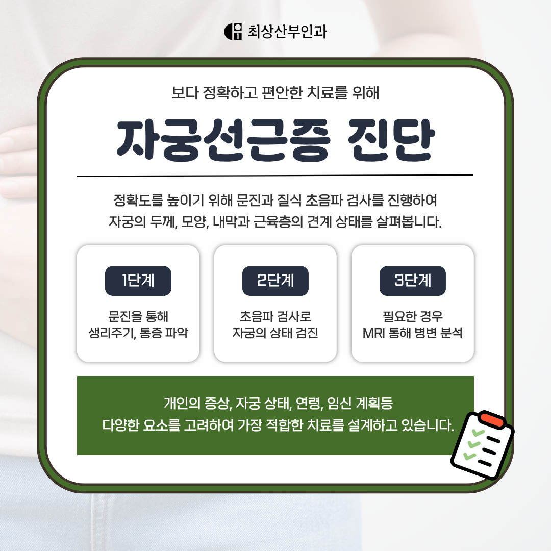 최상산부인과에서는 자궁선근증이 의심되는 환자에게 보다 정확한 진단을 위해 정밀 검사를 원스톱으로 진행합니다. 병원 내 자체 MRI 센터가 마련되어 있어, 외부 이동 없이 진료와 검사를 한곳에서 받을 수 있죠. 이외에도 아래와 같은 검사들을 진행하며 하이푸 시술이 가능한 상태인지 정밀하게 검진한 뒤 치료방향을 설정하고 있어요.