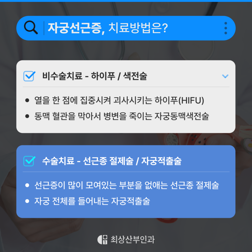 최상산부인과는 자궁선근증 환자 개개인의 상태를 면밀히 평가하여 하이푸·복강경 등 최적의 치료법을 안전하게 적용하고 있습니다. 자궁의 기능을 지키고 통증 없는 일상으로 회복할 수 있도록 오늘도 한 분 한 분의 치료에 최선을 다하겠습니다.