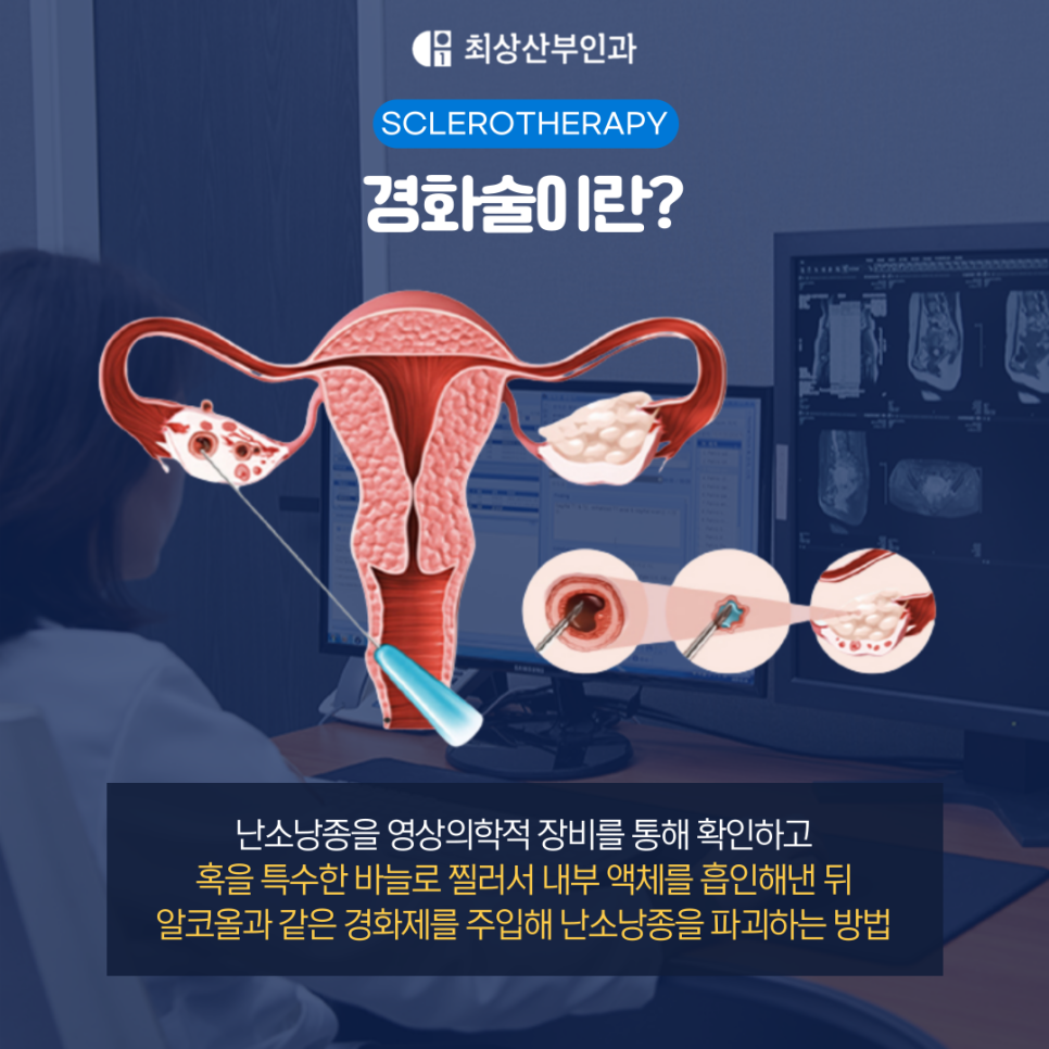 난소낭종의 치료 방식에는 수술적 치료와 비수술적 치료가 있습니다. 이 중 비수술적 치료 방법에는 경화술이 있는데요. 경화술이란 비침습적 치료의 한 종류로, 각종 액체가 들어있는 난소낭종을 영상의학적 장비를 통해 확인하고 그 이후 혹을 특수 바늘로 찔러서 내부 액체를 흡인해낸 뒤 알코올 등의 경화제를 주입하여 낭종을 파괴하고 치료하는 방식입니다.