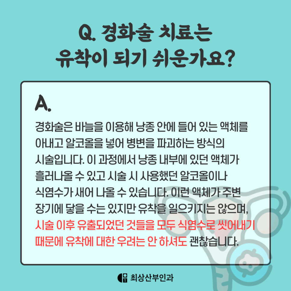 유착이란 쉽게 말해 자궁과 난소, 나팔관 등이 서로 달라 붙는다는 것입니다. 경화술은 바늘을 이용해서 낭종 안에 있는 액체를 뽑아내고 알코올을 넣어 병변을 괴사시키는 방식의 시술인데요. 이 과정에서 낭종 내부에 있던 액체가 흘러 나오기도 하고 시술 시 사용했던 알코올이나 식염수가 새어 나오기도 합니다.