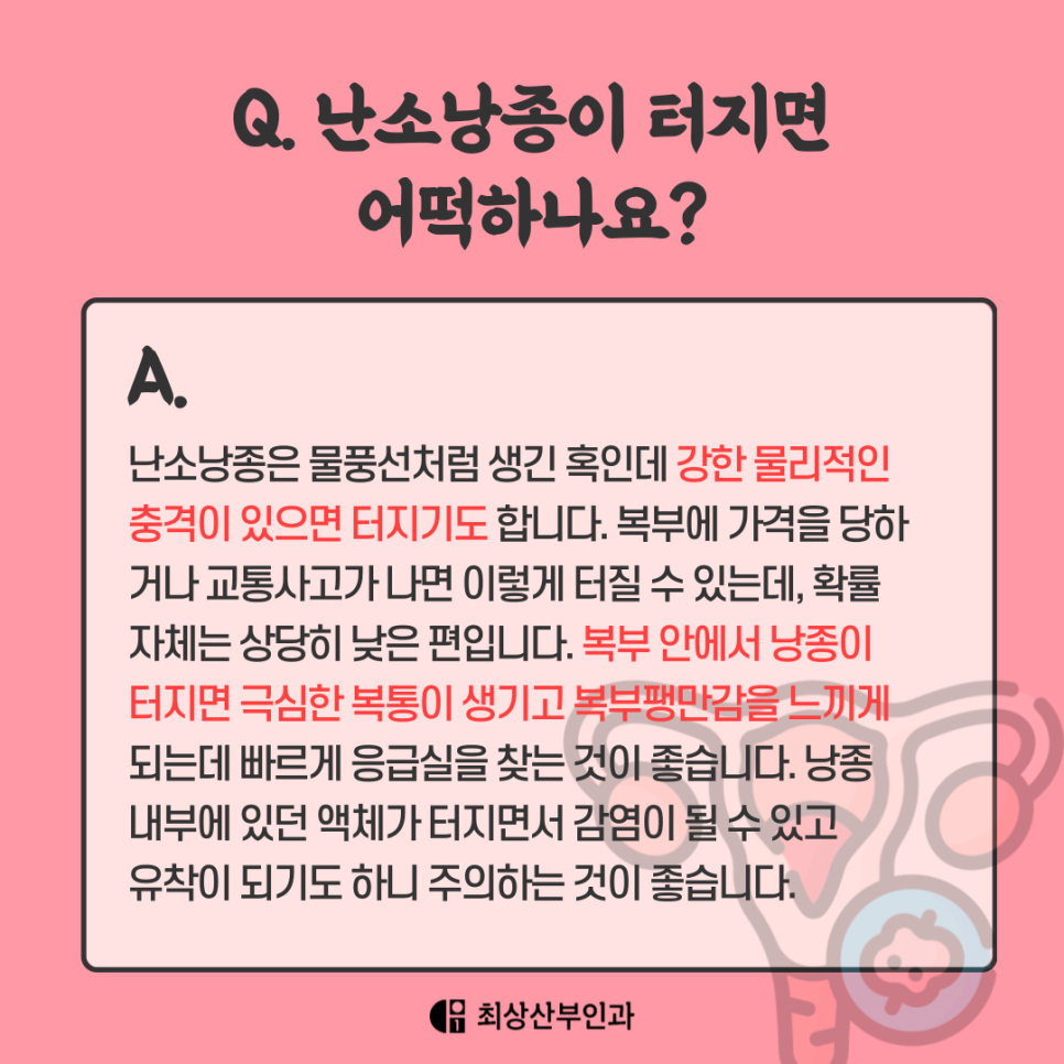 이렇게 난소낭종이 파열되면 빠르게 응급실을 찾는 것이 좋은데요. 낭종 내부에 있던 액체가 터지면서 감염이 될 수도 있고 유착이 되는 경우도 있어 주의하는 것이 좋습니다.