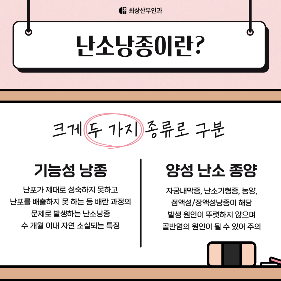 반면 난소기형종과 같이 배란이 발생한 이후에도 난포가 혹처럼 남아 있는 경우를 양성 난소 종양 혹은 난포성 안종이라고 해요. 이는 명확한 발병원인도 아직 밝혀지지 않았으며, 기능성 낭종과 달리 자연적으로 없어지지 않고 점점 커지게 될 수 있어 골반염을 유발하는 원인이 될 수 있기 때문에 강남구산부인과 최상산부인과에서 적극적으로 대처를 하는 것이 좋다고 합니다.