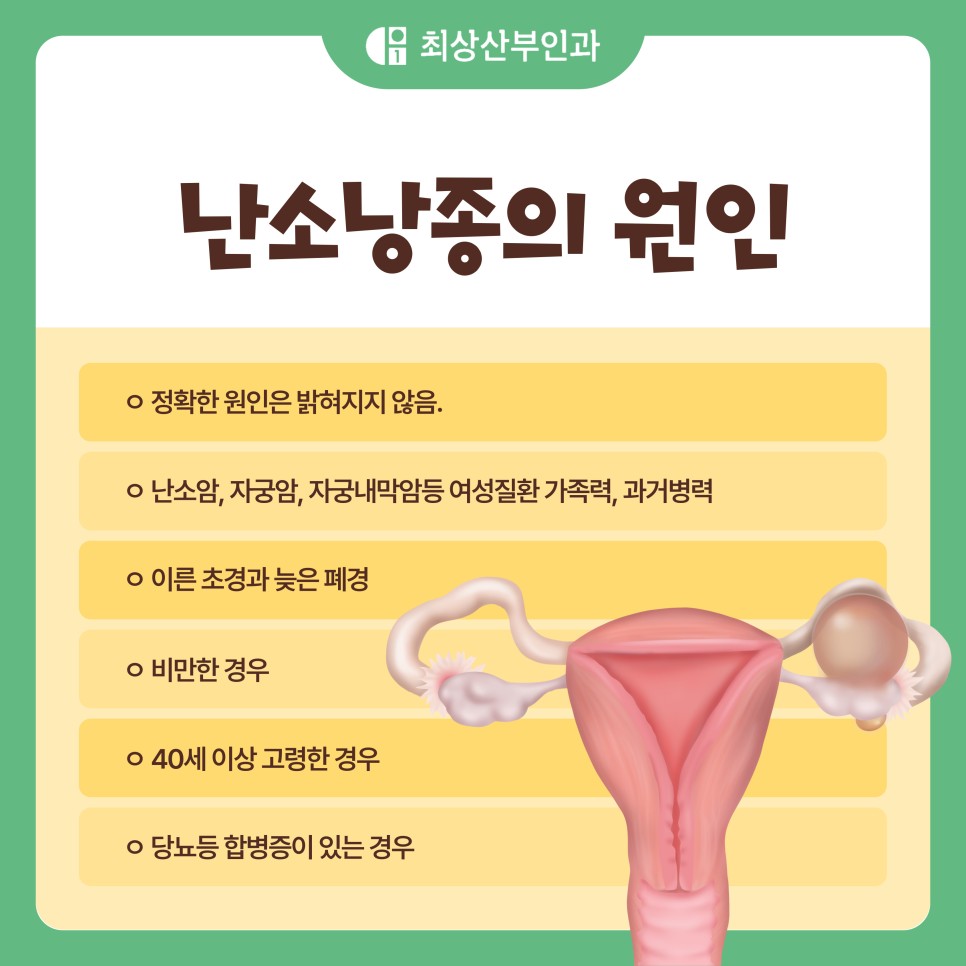 난소암 가족력이 있는 경우 난소낭종 발병률이 많게는 3배 이상 올라간다고 하니 특히 주의가 필요하며 변이와 같은 유전자 이상 역시도 위험요인입니다. 난소는 여성호르몬의 영향을 많이 받는데 이른 초경과 늦은 폐경으로 인해 여성호르몬에 노출되는 시기가 길어지면 그만큼 난소낭종 발병률도 올라간다고 해요. 더불어 자궁내막암과 가중개막형암을 발생하기는 요인이 되기도 하죠.