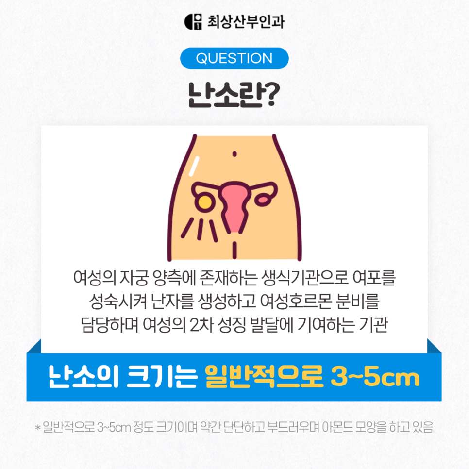 먼저 난소는 여성의 자궁 좌우에 위치하고 있으며 일반적으로 3~5cm 정도의 크기를 갖고 있습니다. 여포를 성숙시켜 난자를 배출하는 배란과 여성호르몬의 분비를 담당하고 있기 때문에 2차성징이 시작된 후의 여성 즉, 가임기 여성이라면 난소 건강에 주의를 기울여야 하는데요.