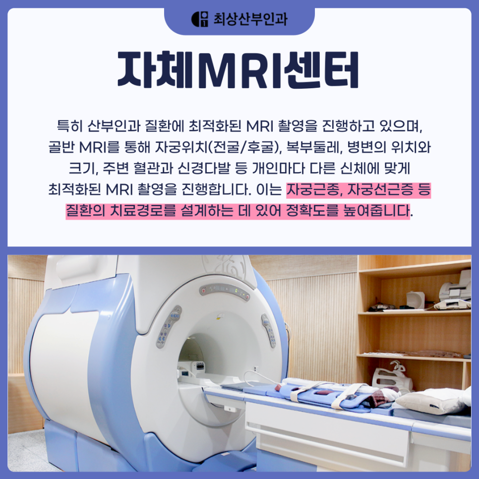 저희 최상산부인과는 자체MRI센터를 보유하고 있어 정밀한 진단이 가능하며 영상의학, 생식, 내분비, 난임 산부인과 전문의의 유기적인 협진 시스템을 통해 개인의 특성을 고려한 1:1 맞춤 치료가 가능하니 안심하고 내원하시기 바랍니다.
