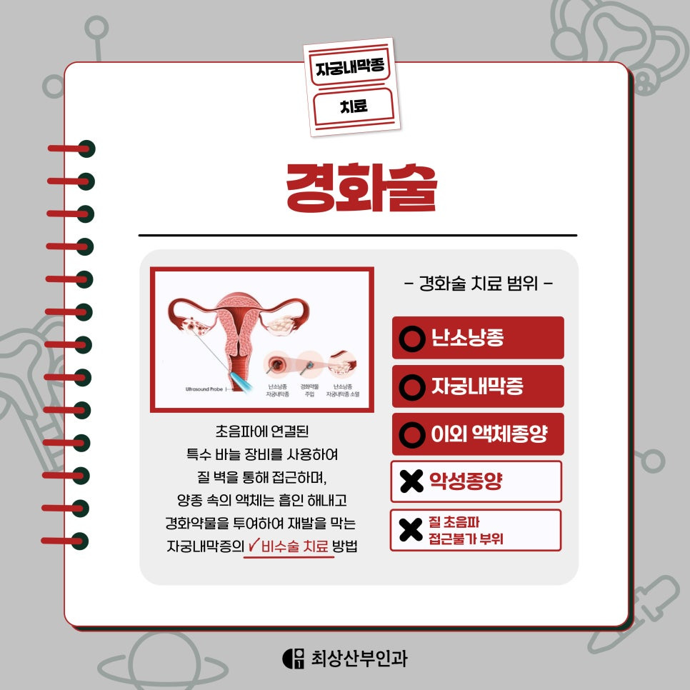자궁내막종을 치료하기 위해서는 정상 자궁 조직을 최대한 보존하면서도 효과적으로 병변을 제거하는 것이 중요합니다. 최상산부인과에서는 자궁 적출이 없는 최소 침습적인 방법인 '경화술'을 시행하고 있습니다.