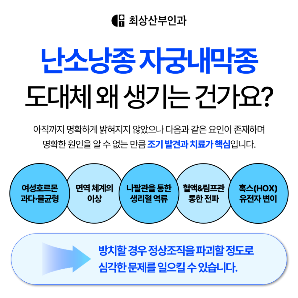 이러한 문제는 보통 면역체계의 이상으로 인해 발생하며 여성호르몬 과다로 인한 불균형이나 유전자 변이가 원인이 되기도 해요. 또한 나팔관으로 생리혈이 역류하는 것이 이나더라도 혈액이나 림프관을 타고 내막조직이 유입되기도 하죠.