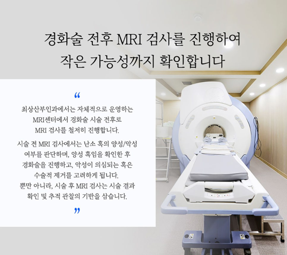 최상산부인과는 내과검진센터를 운영하고 있으며 MRI 장비를 보유하고 있기 때문에 빠르고 신속한 검사가 가능해요. 대학병원을 찾지 않더라도 내원한 당일에 바로 검사를 진행할 수 있어 시간적 여유가 부족한 환자분들의 부담을 줄여드리고 있어요.