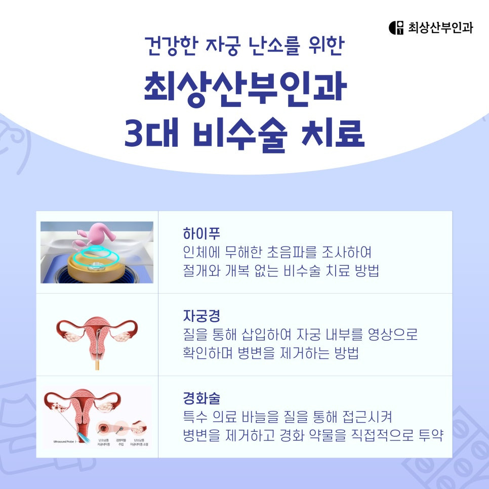 비수술 치료는 자연적인 신체 리듬을 회복할 수 있다는 점에서 매우 중요한 치료방법인데요, 불필요한 수술로 난소 기능이 저하되는 것을 방지하고, 정상적인 배란을 유도할 수 있도록 도와요. 또한, 임신을 계획하는 분들에게도 부담이 적죠. 최상산부인과에서는 자궁 보존 치료를 우선적으로 시행하며, 3대 비수술 치료 방법인 하이푸(HIFU), 경화술, 자궁경 치료를 모두 제공하고 있어요. 이러한 치료법을 통해 개개인의 상황에 맞는 맞춤 치료가 가능하답니다. 약물 치료와 생활 습관 교정을 통해 자궁과 난소 기능을 정상적으로 유지하는 것이 장기적으로 좋은 선택이 될 수 있어요.