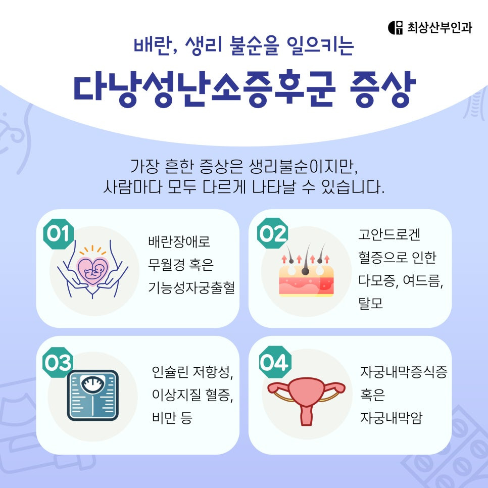 다낭성난소증후군이 발병하면 가장 흔한 증상은 생리 불순이에요. 생리가 2~3달에 한 번씩 오거나, 몇 개월 동안 아예 생리를 하지 않는 경우가 많죠. 강남산부인과로 찾아주시는 저희 최상산부인과에서도 29세 직장인 A 씨는 규칙적인 생리를 했지만 최근 6개월 동안 한 번밖에 하지 않아 찾아주셨는데 검사 결과 다낭성난소증후군 진단을 받았죠. 또 다른 사례로 32세 B 씨는 여드름이 심해지고 체중이 빠르게 증가하면서 배란 장애가 생겼어요. 이러한 증상들은 단순한 호르몬 변화로 생각하기 쉽지만, 장기적으로 방치하면 배란 장애로 인해 임신이 어려워질 가능성이 크답니다.